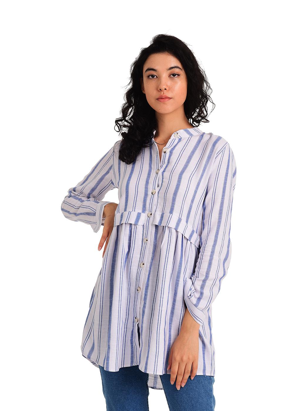 - Beyaz / mavi çizgili hakim Yaka, ön düğmeli, Fırfır detaylı tunik gömlek ile kombin yapmak çok daha kolay olacak