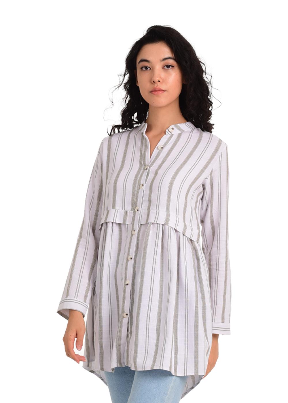 - Beyaz / haki çizgili hakim Yaka, ön düğmeli, Fırfır detaylı tunik gömlek ile kombin yapmak çok daha kolay olacak