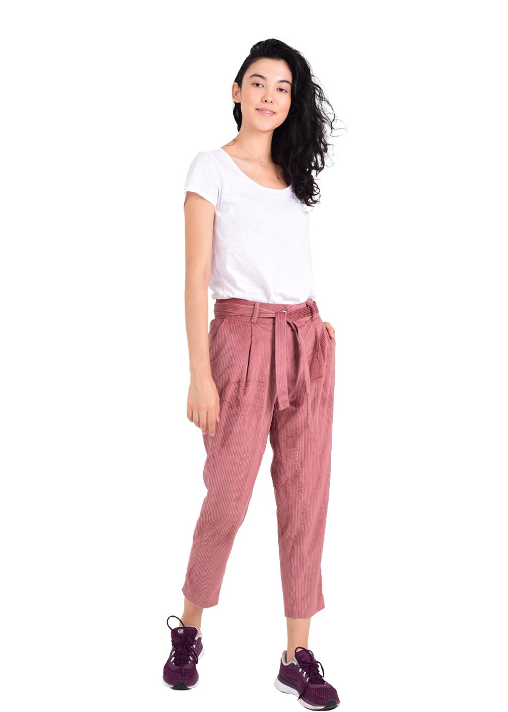 - Bel kurdeleli yüksel bel kadife pantolonun yan ve arkalarında cep var