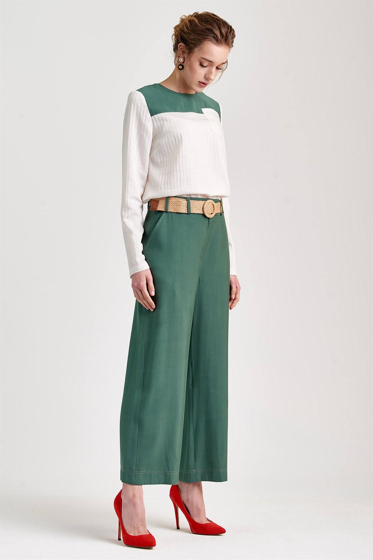 Hasır Kemer Detaylı Yeşil Pantolon G1128