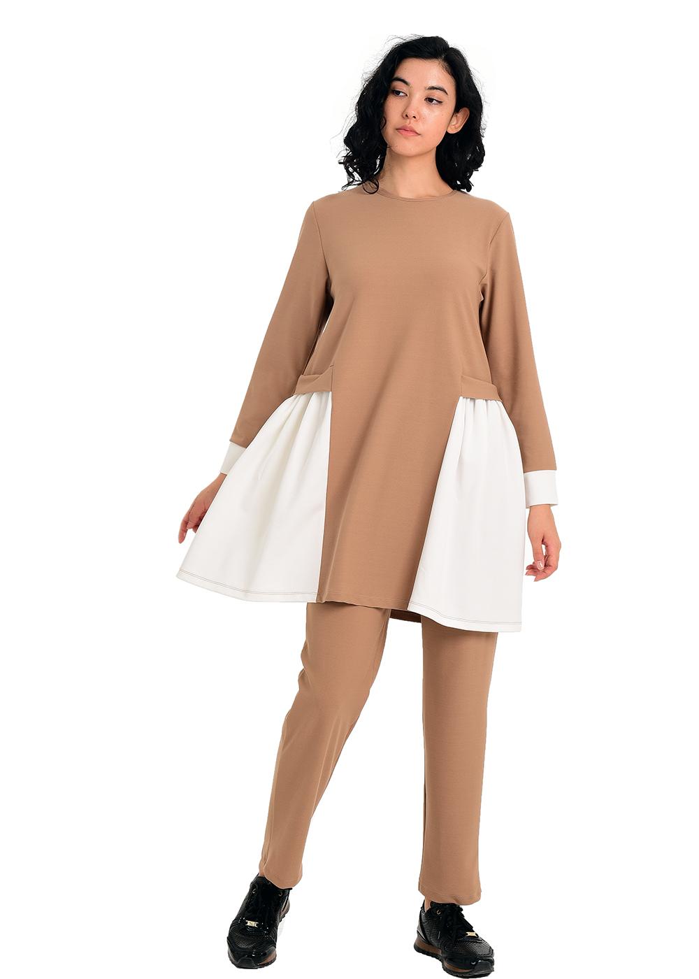 - Yanlardan büzgülü tunik takım, kol manşet ucları renkli, yuvarlak yaka, bloklu renklerden oluşan ikili takım